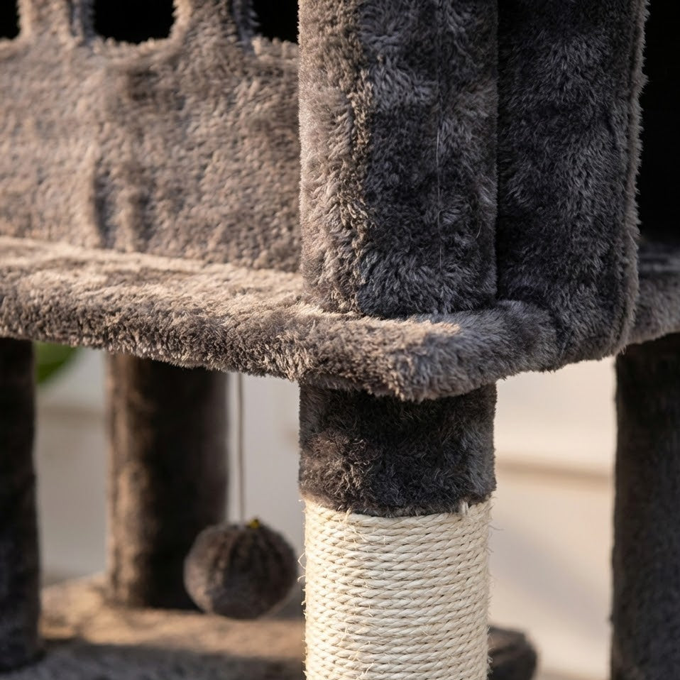 Arbre à chat de grande taille (170 cm) conçu pour l'escalade, le repos et l'exercice. Sa structure multi-niveaux est adaptée aux chats de grandes races, comme les Maine Coon, et peut accueillir jusqu'à 6 animaux simultanément. Fabriqué avec des matériaux robustes, cet arbre inclut des poteaux renforcés et une base double couche pour une stabilité accrue.